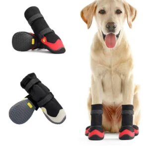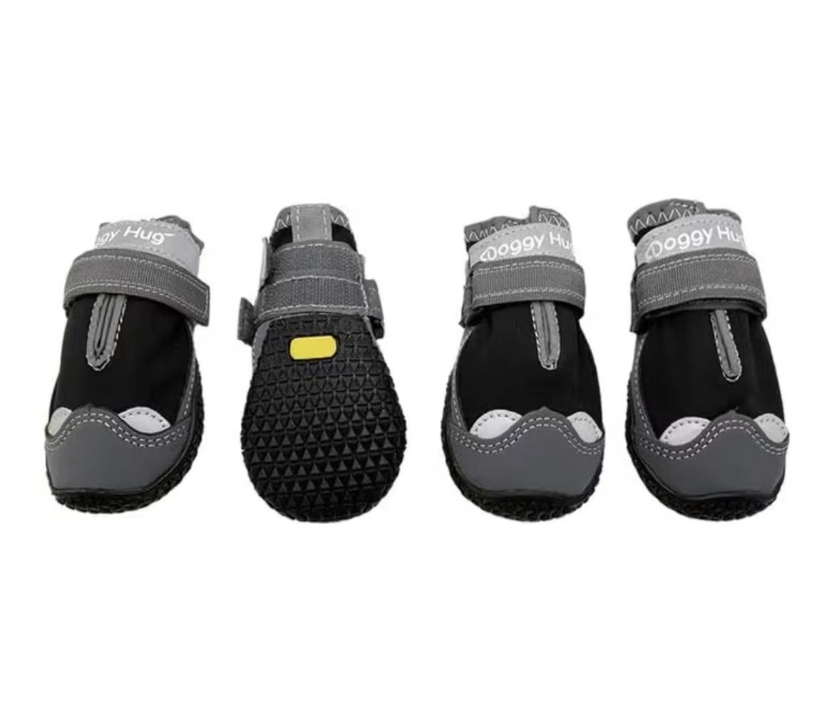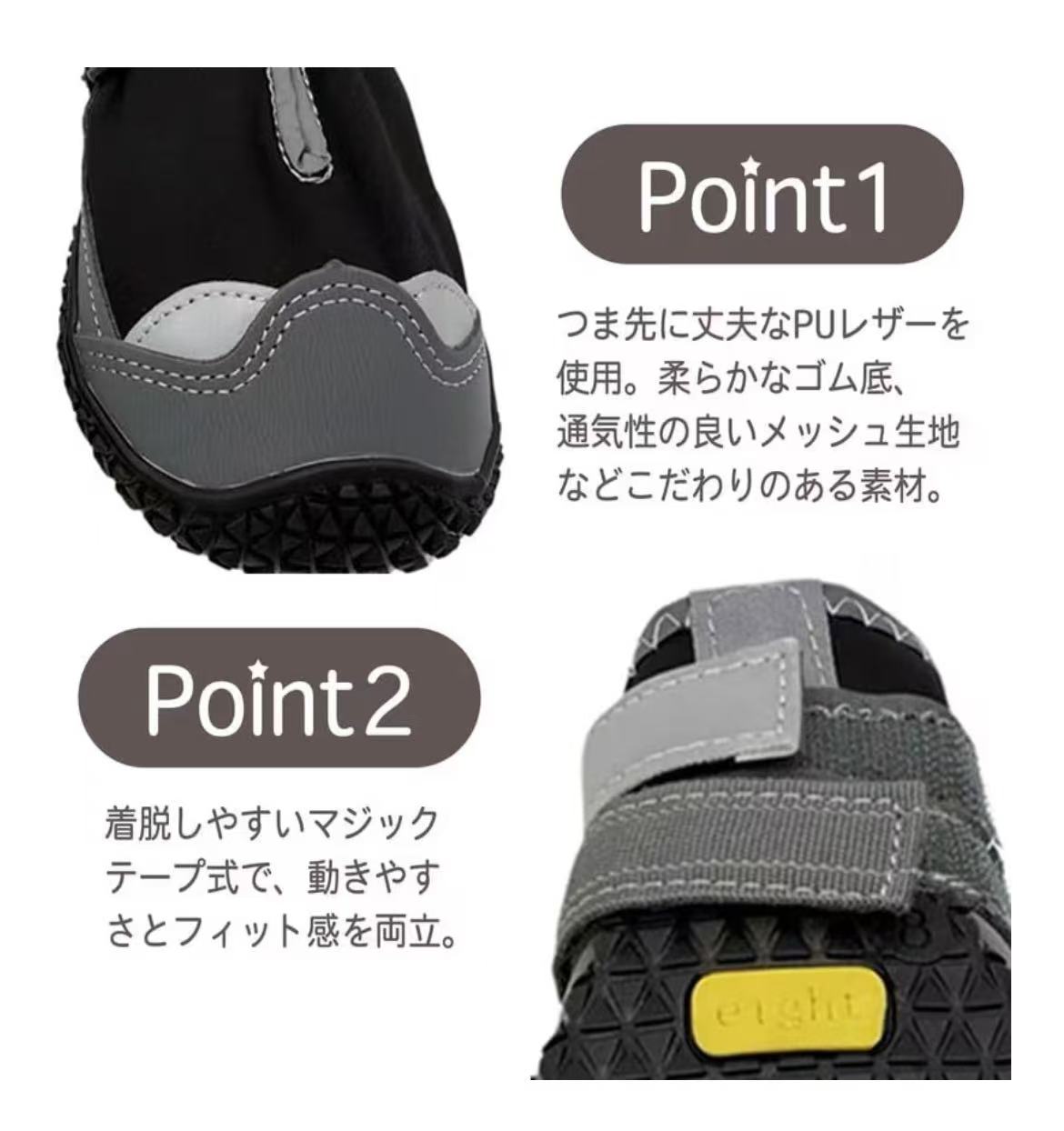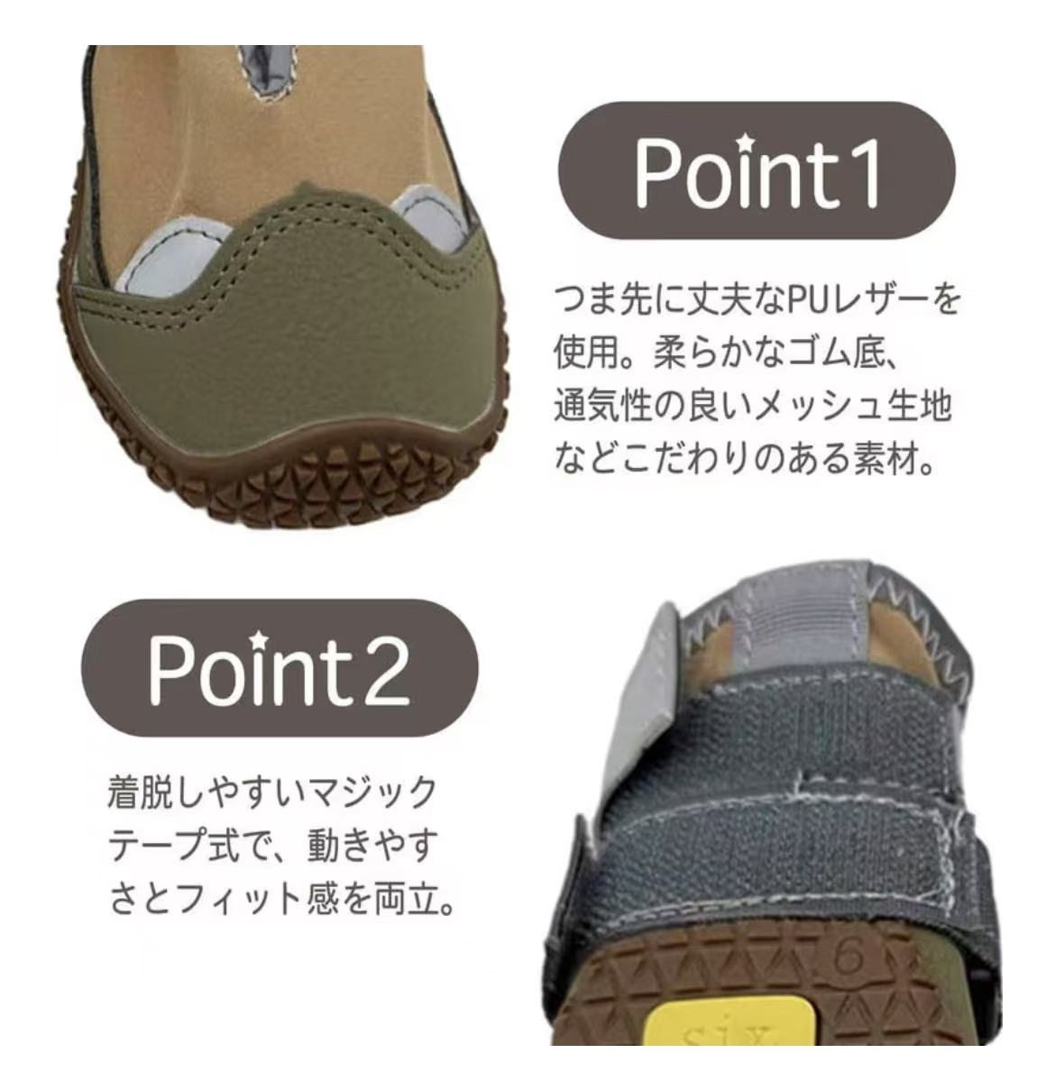 簡単に着脱できて、ズレにくいマジックテープ式。光に反射するリフレクティブテープで夜間のお散歩も安心です。つま先などはPUレザーで補強、防水・撥水加工生地でお手入れもしやすく耐久性にも優れています。